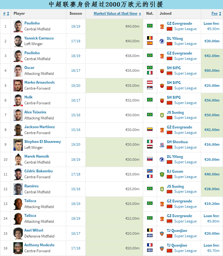 从2011年到2020年期间,中超联赛成为整个亚洲的焦点,包括保利尼奥、奥斯卡、德罗巴、阿内尔卡、拉维奇、马斯切纳诺、卡拉斯科等众多顶级球星都在中超留下过身影。