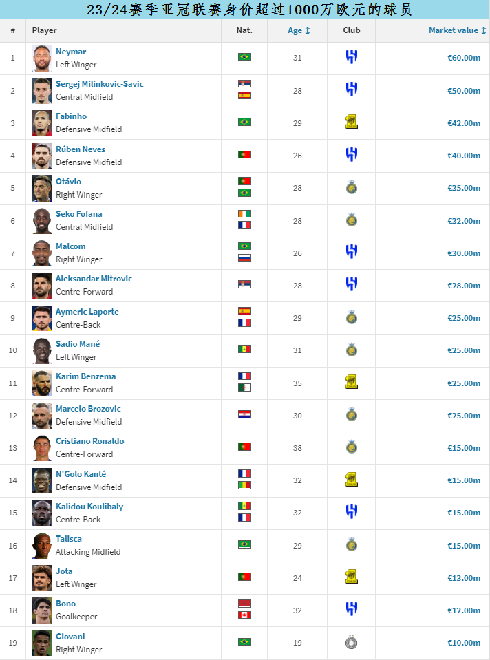 本赛季亚冠联赛中共计有19名球员的身价超过1000万欧元,其中只有效力于卡塔尔联赛萨德俱乐部的巴西前锋乔瓦尼是非沙特联赛球员。