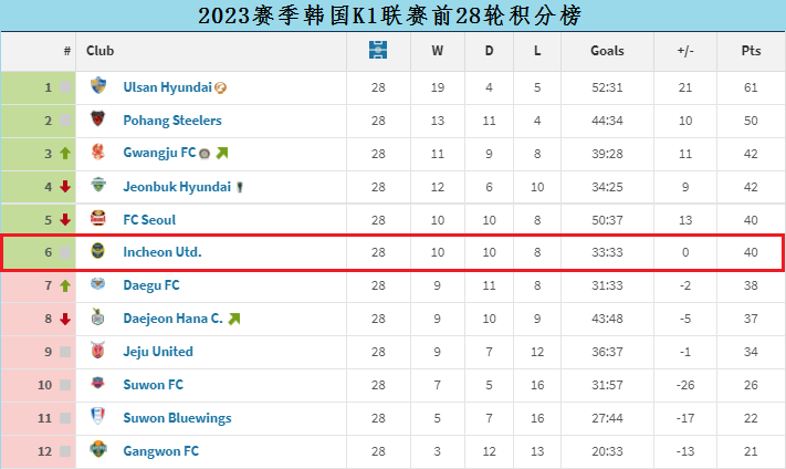 仁川联在本赛季国内联赛前28轮联赛已经落后领头羊蔚山现代多达20分,位列联赛第6。球队在本赛季联赛攻守两端的表现都处于联赛中游,前28轮的净胜球为0。