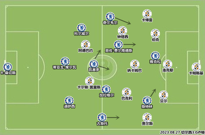 身前有冲击力很强的雅克松和斯特林压制防线,身旁有两名覆盖能力很强的搭档保驾护航,恩佐-费尔南德斯可以全力投身到进攻中,一众冲击型球员的身边也需要这样的传球高手作为指挥官。送出全场最多的8次长传,4次射门有2次中框,恩佐-费尔南德斯展现出了作为进攻型中场的实力,精于长传发牌和后插上射门的特点非常适合与雅克松、斯特林搭档。