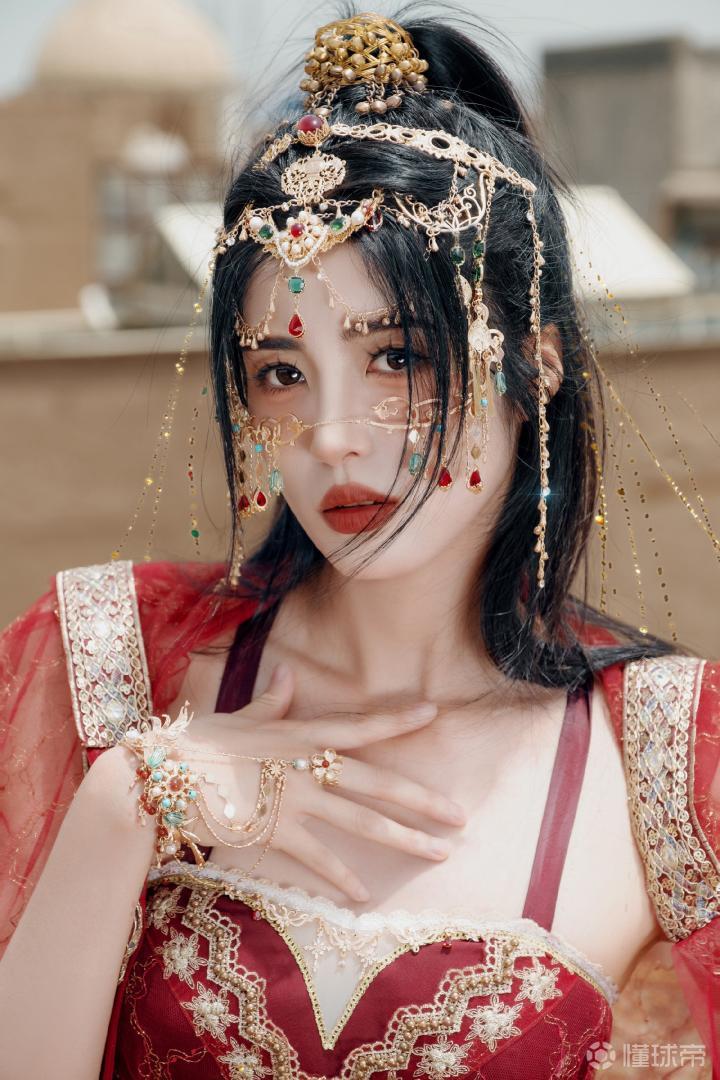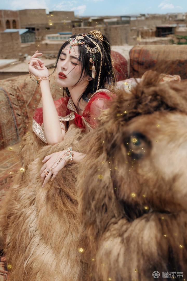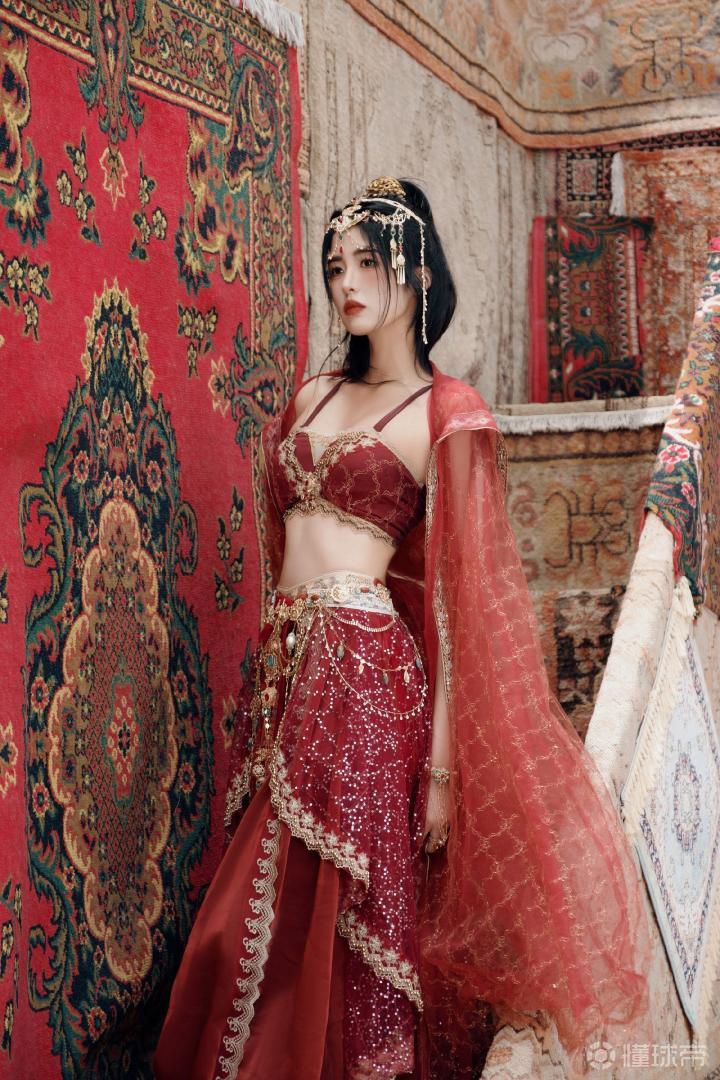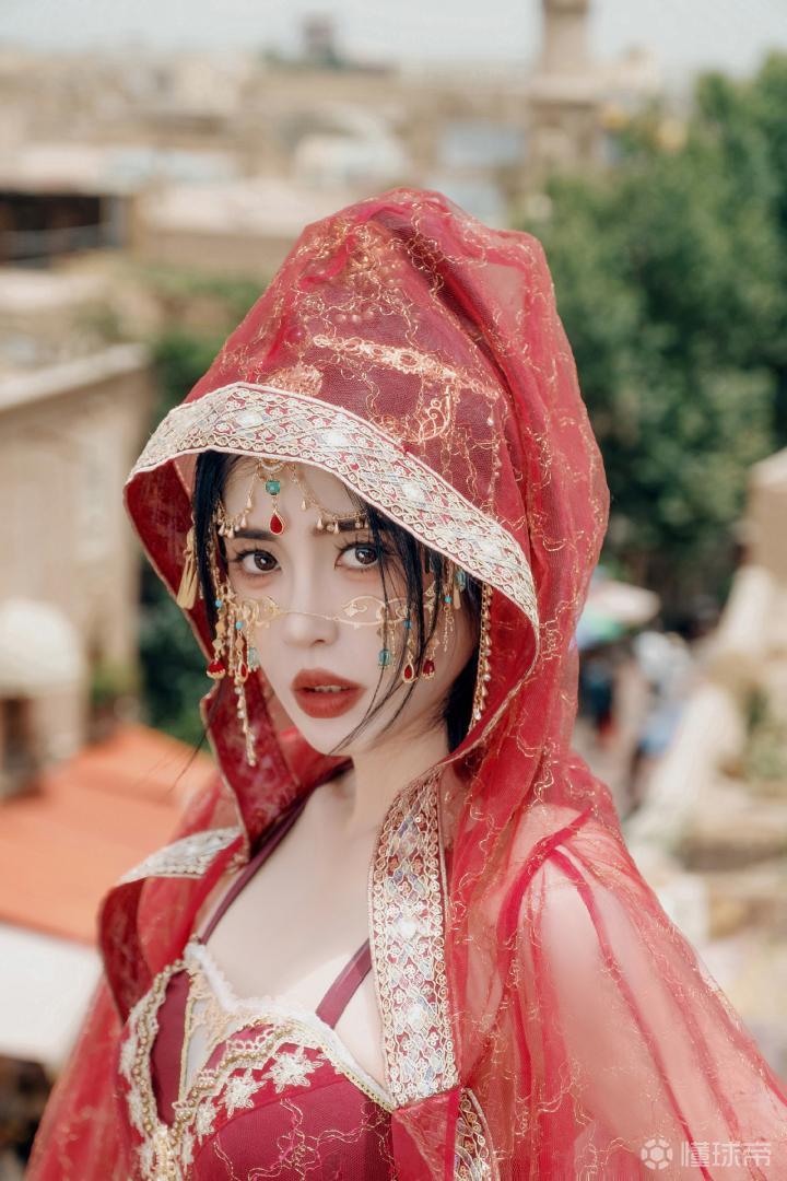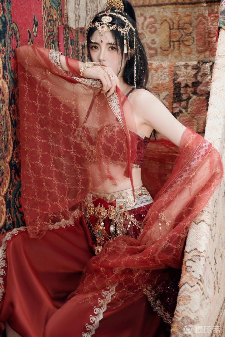 前中国女足、上海女足球员赵丽娜来了遥远的西域之地,拍摄了一组颇有古代西域风情的红裳写真。