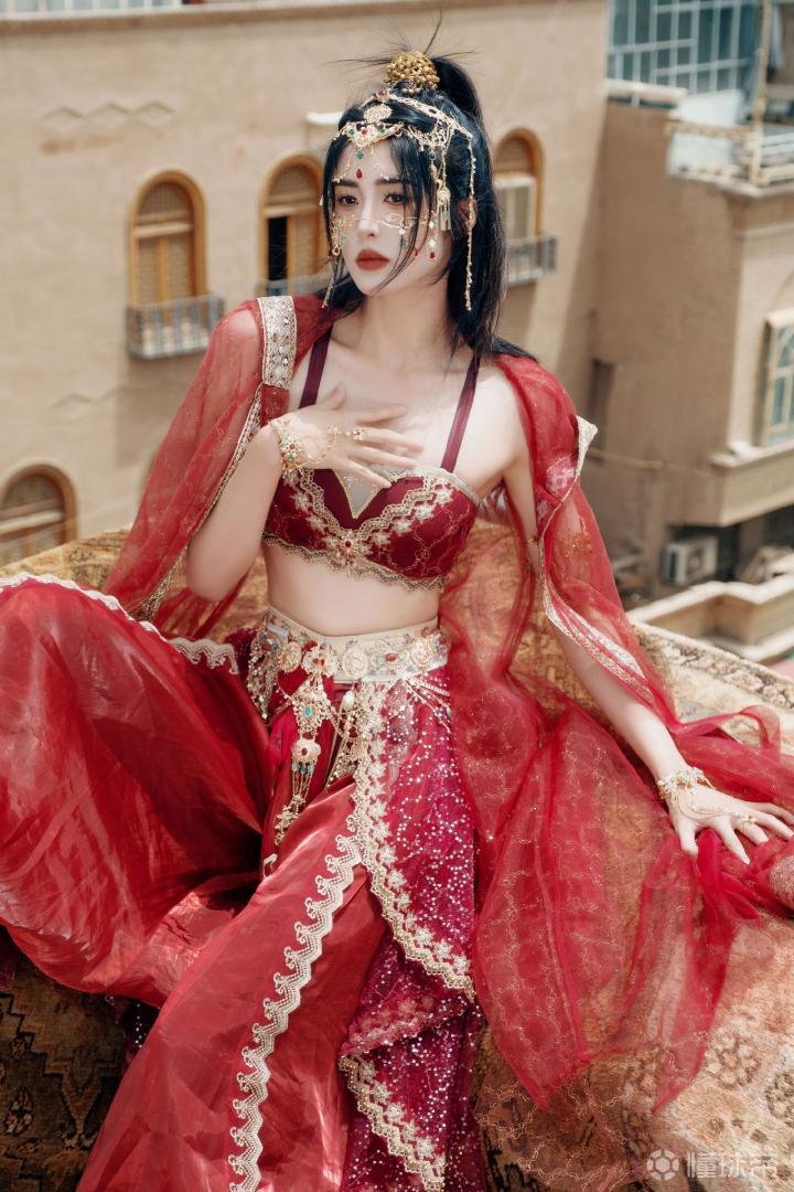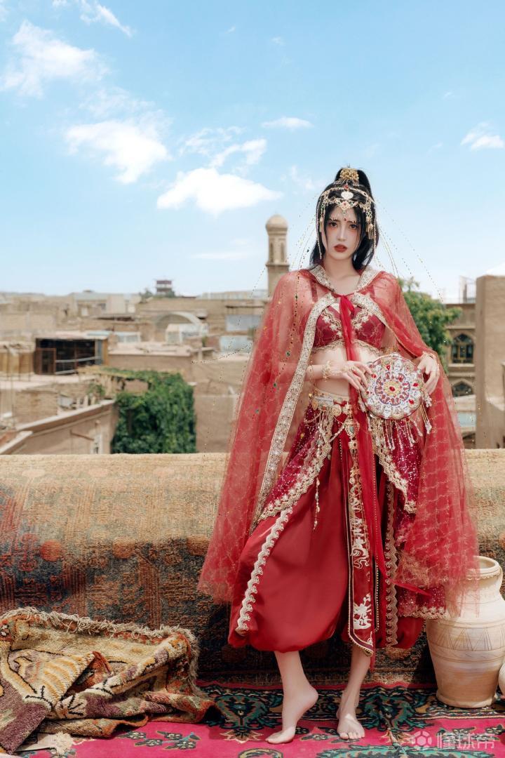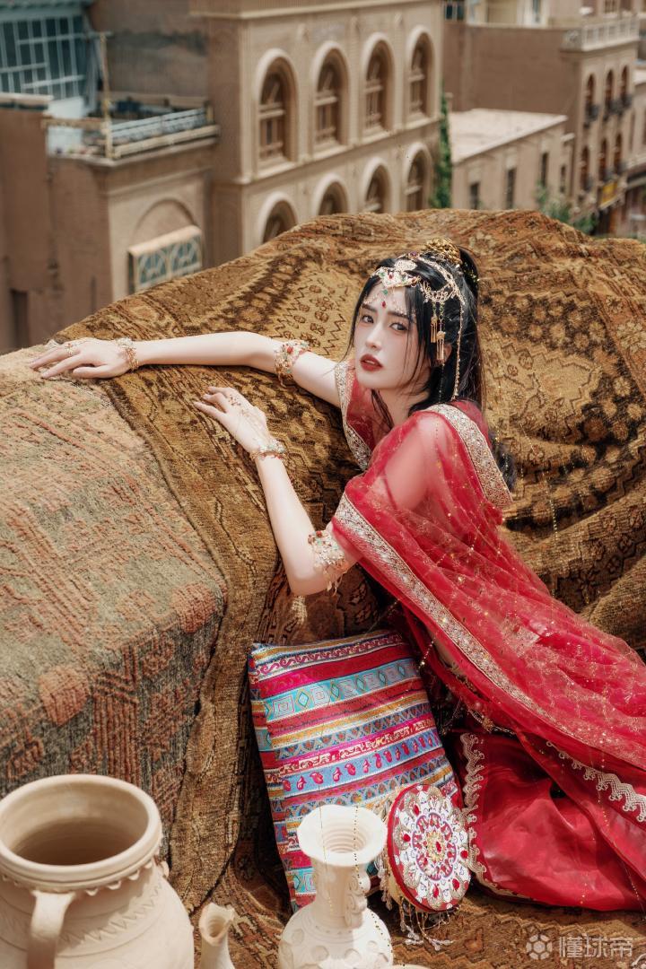站在那古城的天台上,西域少女穿着红装,赤着脚丫正缓步走来。黄土构建的城邦下,她精致的妆容,艳丽的服饰让整个城市都焕发光彩。