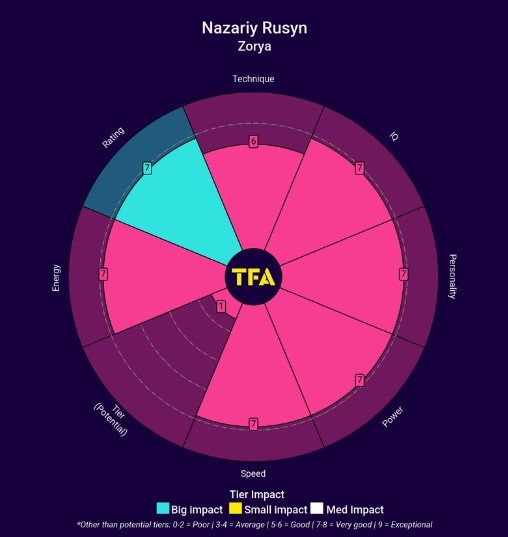 TFA认为鲁辛可以在转会到桑德兰后也拿到不错的评分,将对俱乐部产生巨大影响。他有着不错的球商7、技术6、性格7、以及其他的特质,尽管他的所在的级别目前水平被评估为3级(见下图)。