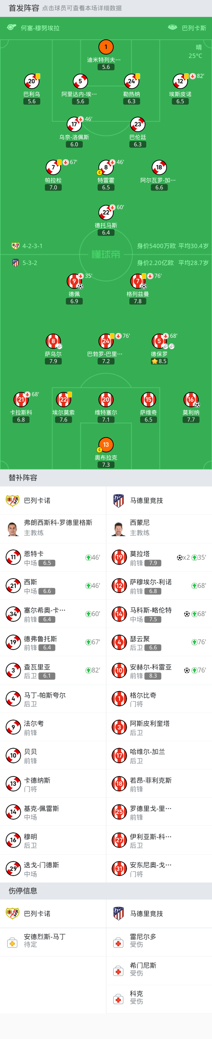 巴列卡诺首发:特雷霍, 阿里达内-埃尔南德斯, 勒热纳, 德托马斯, 迪米特列夫斯基, 巴利乌, 乌奈-洛佩斯, 阿尔瓦罗-加西亚, 埃斯皮诺, 巴伦廷, 帕拉松