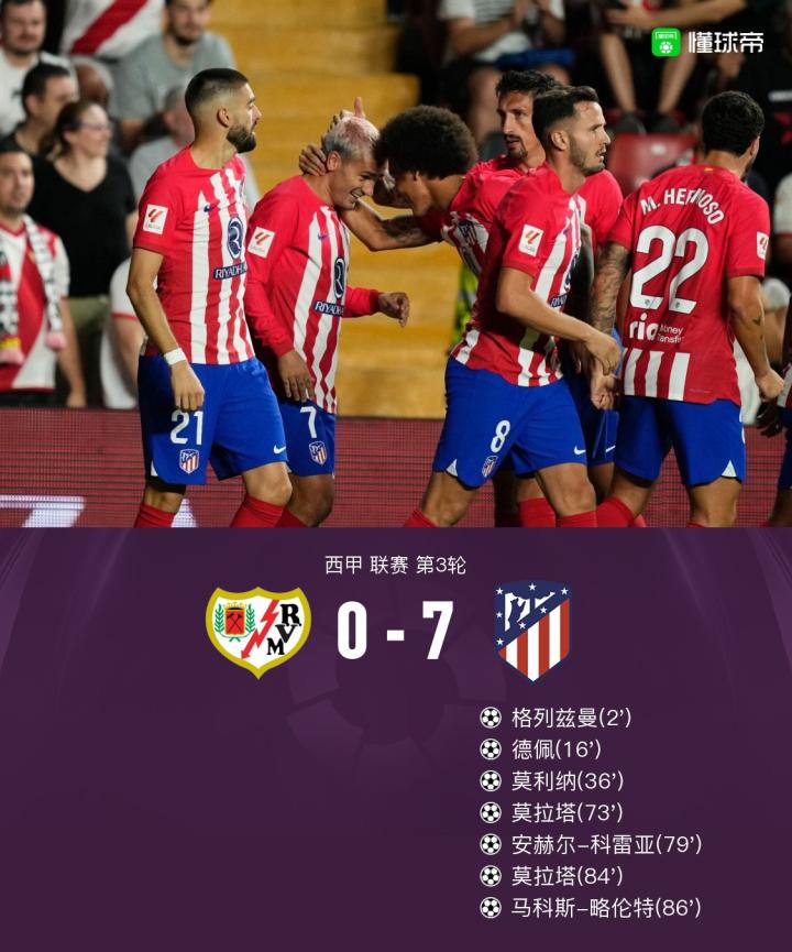 大屠杀!马竞7-0巴列卡诺,莫拉塔双响,格子、德佩建功