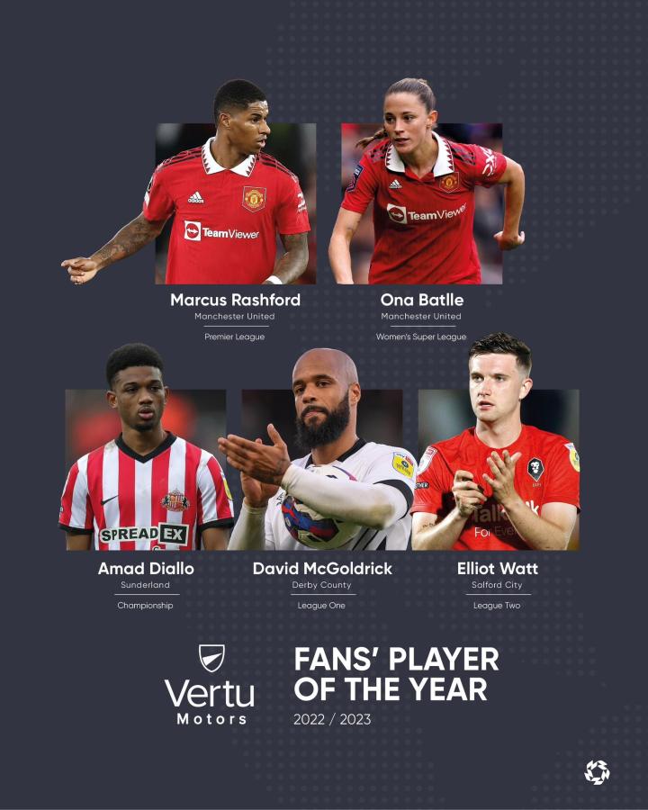 上赛季效力曼联女足的西班牙后卫巴特列则当选PFA球迷票选年度女足英超最佳球员,上赛季效力桑德兰的曼联前锋阿马德-迪亚洛当选PFA球迷票选年度英冠最佳球员,上赛季效力于德比郡的麦戈德里克当选PFA球迷票选年度英甲最佳球员,索尔福德城中场瓦特当选PFA球迷票选年度英乙最佳球员。
