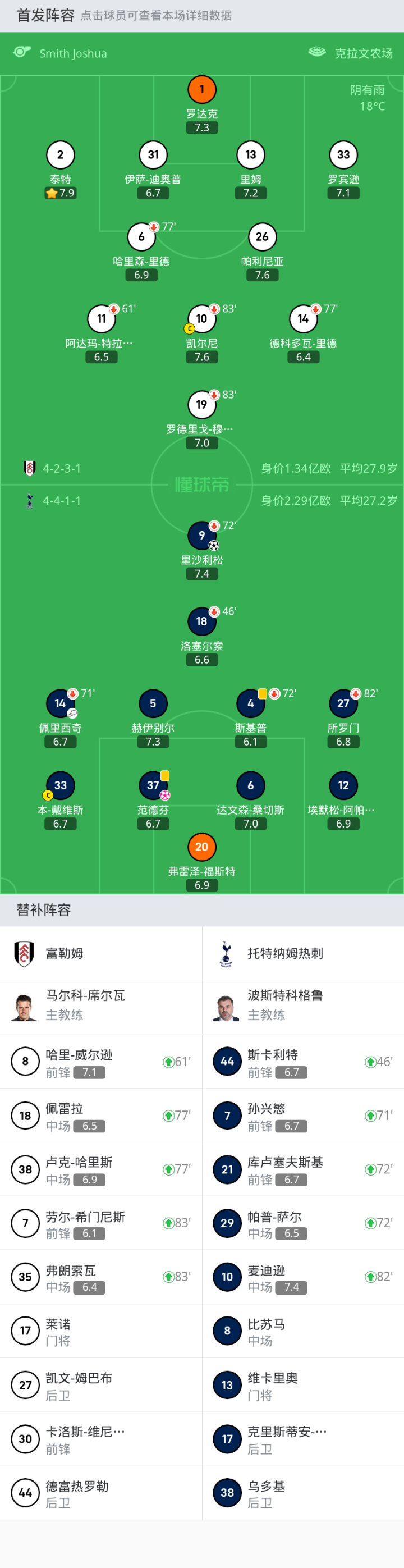 富勒姆首发:凯尔尼, 里姆, 德科多瓦-里德, 泰特, 阿达玛-特拉奥雷, 帕利尼亚, 哈里森-里德, 罗达克, 伊萨-迪奥普, 罗宾逊, 罗德里戈-穆尼斯
