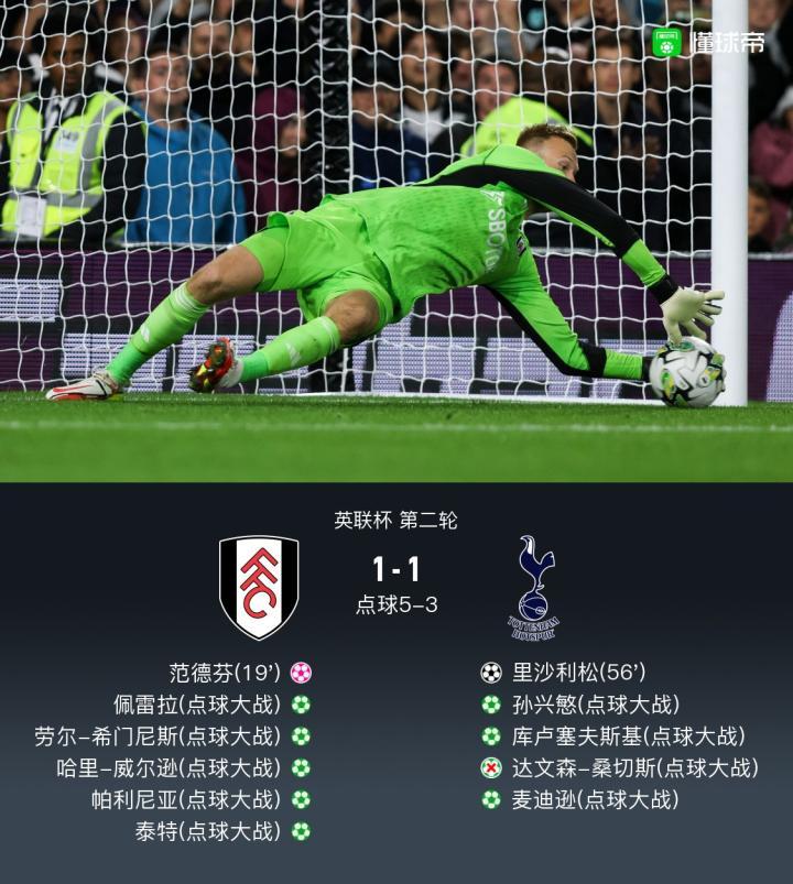 北京时间8月30日,富勒姆在英格兰联赛杯第二轮主场对阵托特纳姆热刺。上半场范德芬自摆乌龙,里沙利松为热刺扳平比分,常规时间双方比分战成1-1,比赛进入点球大战。点球大战中达文森-桑切斯射失点球,其余球员全部罚中。最终富勒姆总分6-4击败托特纳姆热刺,晋级英格兰联赛杯第三轮。