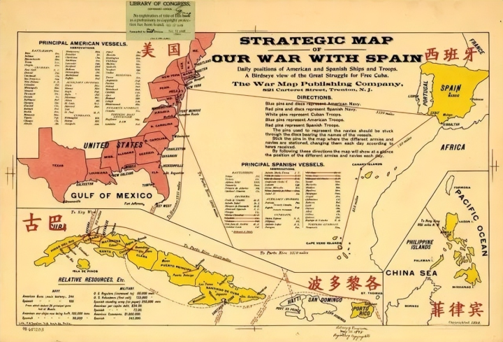 1898年4月,意在夺取西班牙在太平洋(菲律宾群岛和关岛)和加勒比海(古巴岛、波多黎各岛)殖民地的美国借口缅因号事件,挑起美西战争。