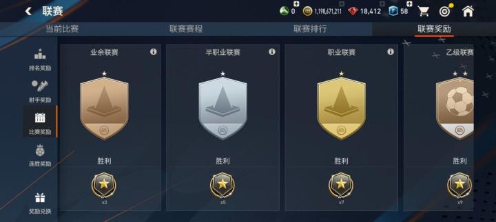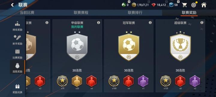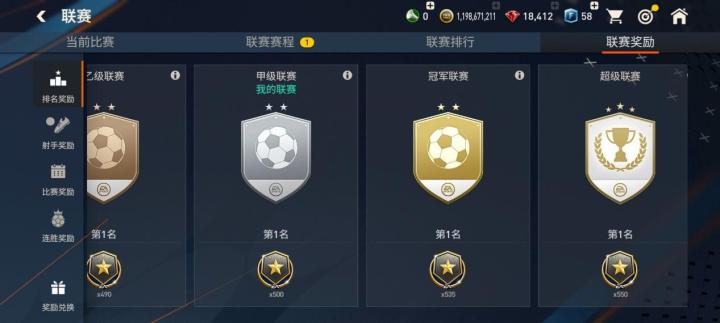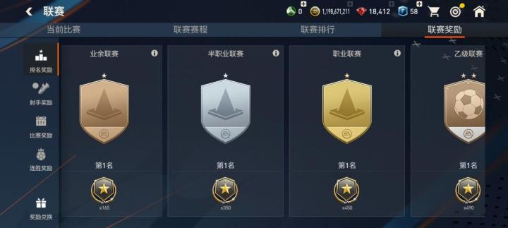 联赛奖励部分中,玩家可以查看自己当前联赛所能获取的所有奖励,包括排名奖励、射手奖励、比赛奖励、连胜奖励。根据赛事级别不同,每个级别赛事的各项奖励数量都会有所不同,赛季级别越高,奖励也越丰富。