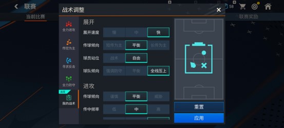 点击调整战术,在我的战术界面,玩家可以依次设置展开、进攻、防守等多项战术要素。玩家也可以直接选择使用左侧的全力进攻、传控为主、寻求反击、全力防守等系统自带战术。战术调整是决定比赛胜负的一个关键因素,玩家需要结合自身阵容选择适合的战术。