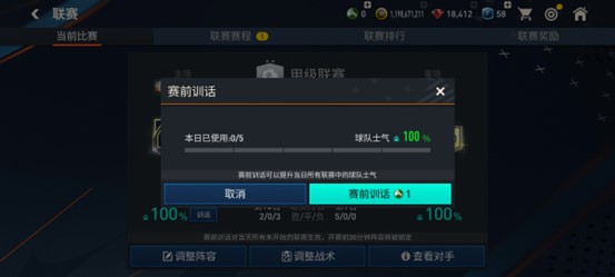 赛前训话是该玩法的一项特点,在每场比赛前,玩家可以使用【训话机会】道具对球队进行训话,提升球队士气。每场比赛最多可以使用5次训话机会道具,训话机会道具可以使用点券或挑战者代币进行购买。