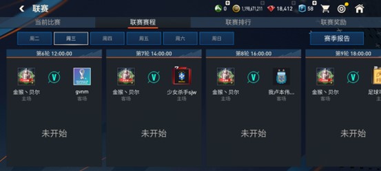 点击不同日期,玩家可以查看后续的比赛对手及比赛时间,每个赛季共有六天时间,每天将从中午12:00开始,每两小时进行一轮,共计进行五轮比赛。