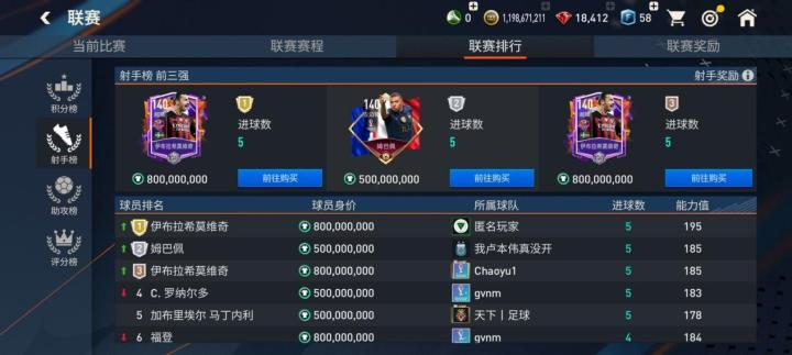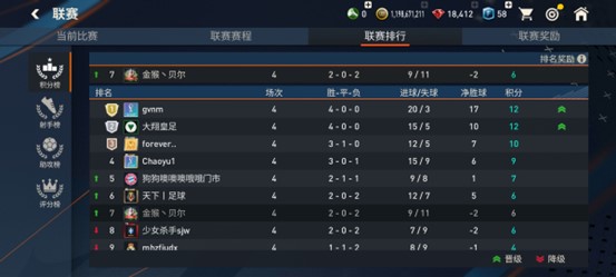 在联赛排行界面中,玩家可以查看本赛季的积分榜、射手榜、助攻榜、评分榜共计四项不同的统计榜单。