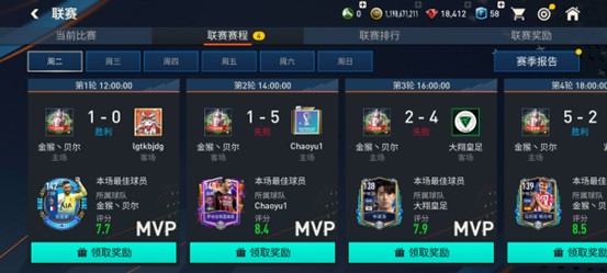 每场比赛结束后,玩家可以查看比赛赛果和本场MVP球员,点击每场比赛下方的“领取奖励”,即可获取本场比赛的对应奖励。