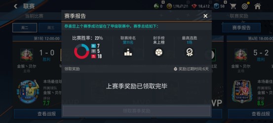 在联赛赛程界面中,玩家可以查看本赛季剩余比赛场次,领取每场比赛奖励及“赛季报告奖励”,是玩家获取奖励的章节。