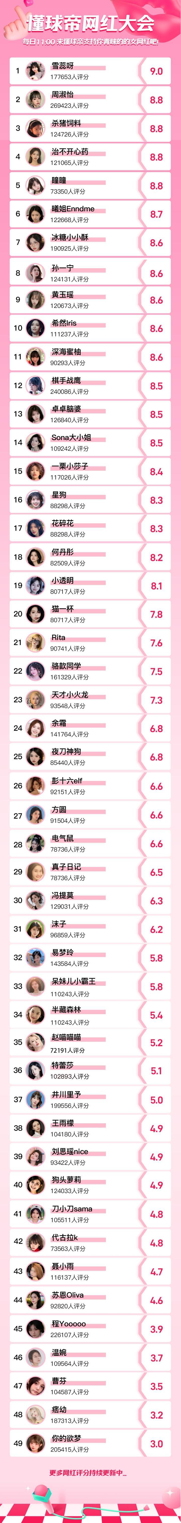 PS:大家反馈的男网红以及足球女网红我们已关注到,后续我们会开设单独赛道的网红喜爱值评选专题,记得来关注哦!