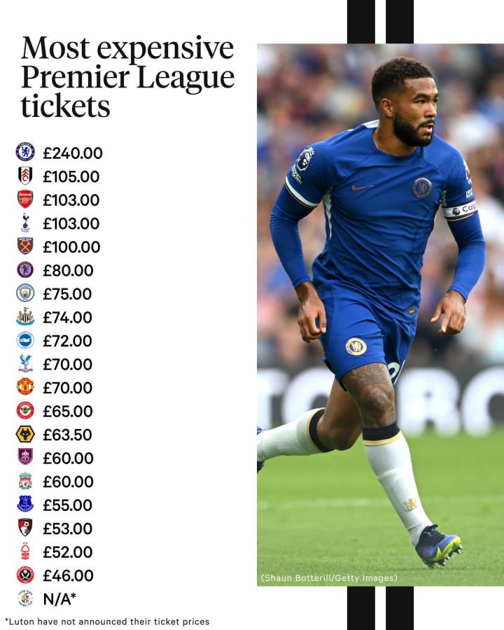 对于各队最贵的票,有五家俱乐部的票价超过了100英镑,分别是我们上文提到的切尔西,还有富勒姆、热刺、阿森纳和西汉姆联。