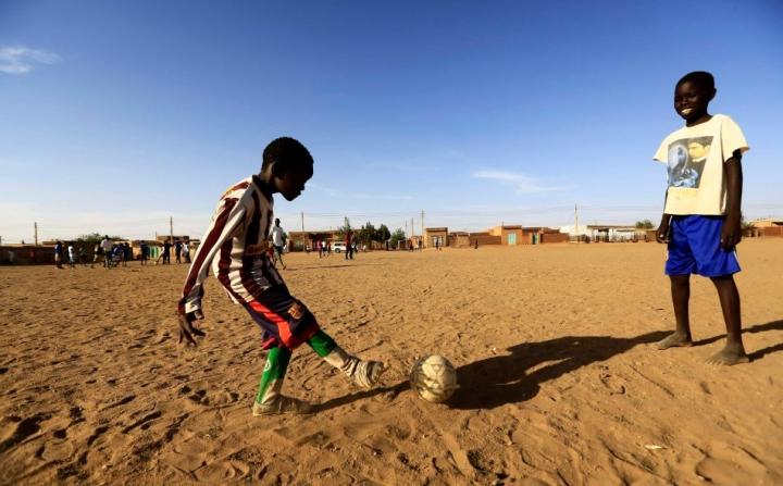 (南苏丹光脚在沙土地上踢球的孩子们)