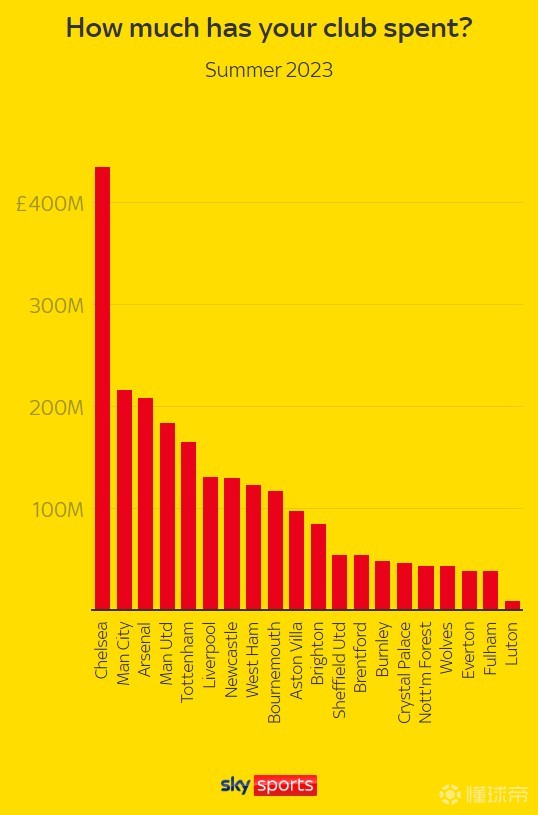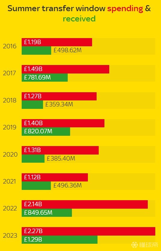 而英超本赛季也获得了超过12.9亿的转会收入,但净支出依然接近10亿镑。具体到俱乐部方面,除了切尔西,曼城和阿森纳在夏窗也都支出超过2亿,9支球队都开销破亿,包括切尔西、曼城、阿森纳、曼联、热刺、利物浦、纽卡、西汉姆和伯恩茅斯。
