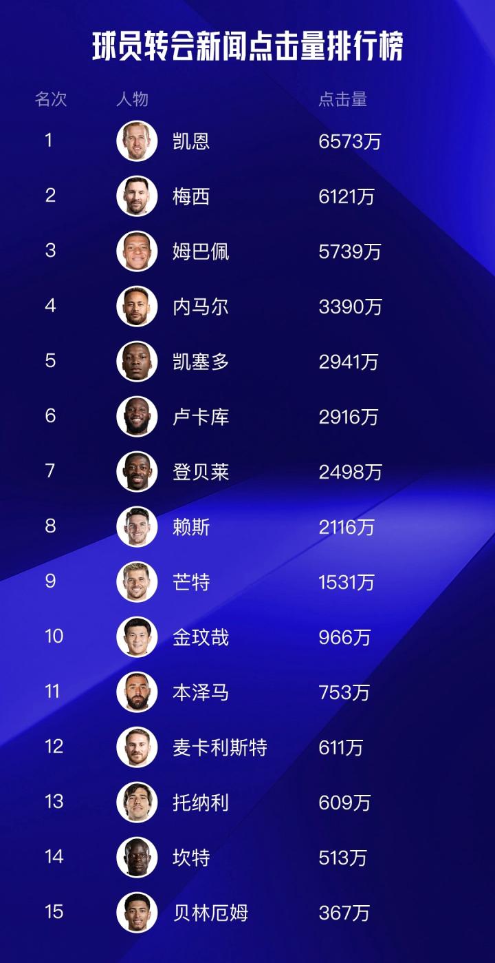 赛季结束后前途未卜的梅西因为回归巴萨和收到来自沙特的天价邀约同样引发了众多关注,与之相对应的还有传闻收到7亿欧元年薪天价的姆巴佩,两人分列流量榜二、三位。