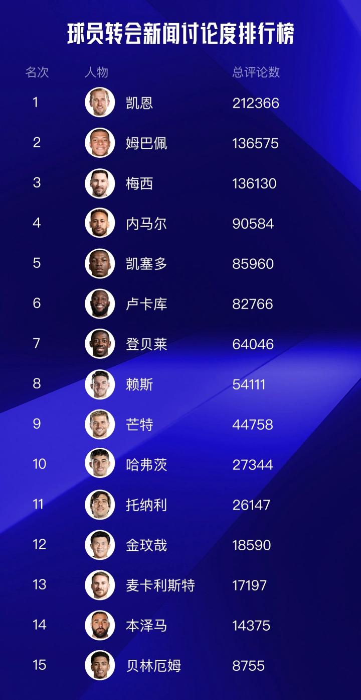 这一次,凯恩实现了断层登顶!无论是姆巴佩还是梅西都难以撼动凯恩的数据。高达20多万条的评论证明了凯恩当之无愧是今夏转会窗的“舆论风暴”。姆巴佩、梅西、内马尔等人紧随其后。有意思的,尽管都是大英帝星,贝林厄姆转会的讨论度显然远不如老大哥凯恩了。