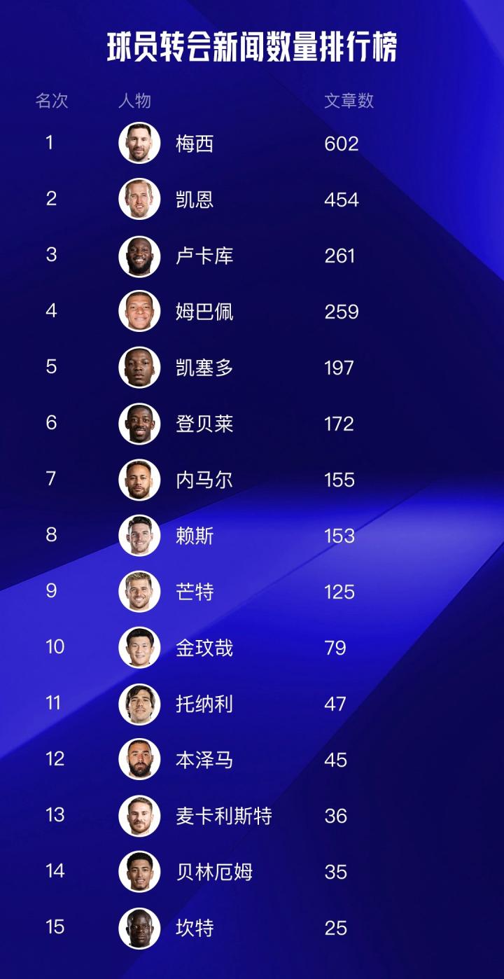 在转会新闻的数量上,梅西以602篇新闻的数据排名断层第一,凯恩屈居第二,看来在列维与拉波尔塔、沙特人的“较量”中,还是后者更为优秀。卢卡库紧随其后,身后还有姆巴佩、凯塞多等人,不难看出,越是干脆利落的转会,数量就越少;不断反转,反复扯皮的转会,就能频繁出现在人们视野中。