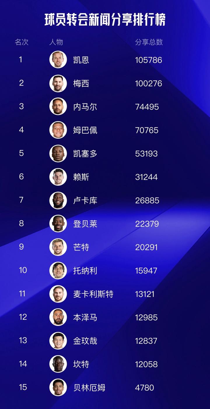 凯恩不鸣则已,一出手就是“三连冠,”讨论度、点击量、分享量三个第一我全都要!梅西的转会新闻同样达到了10万分享+的数据,但距离凯恩仍有一定差距。内马尔和姆巴佩紧随其后。