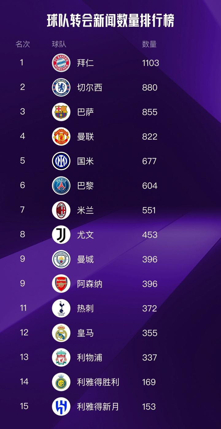 球队转会新闻数量排行