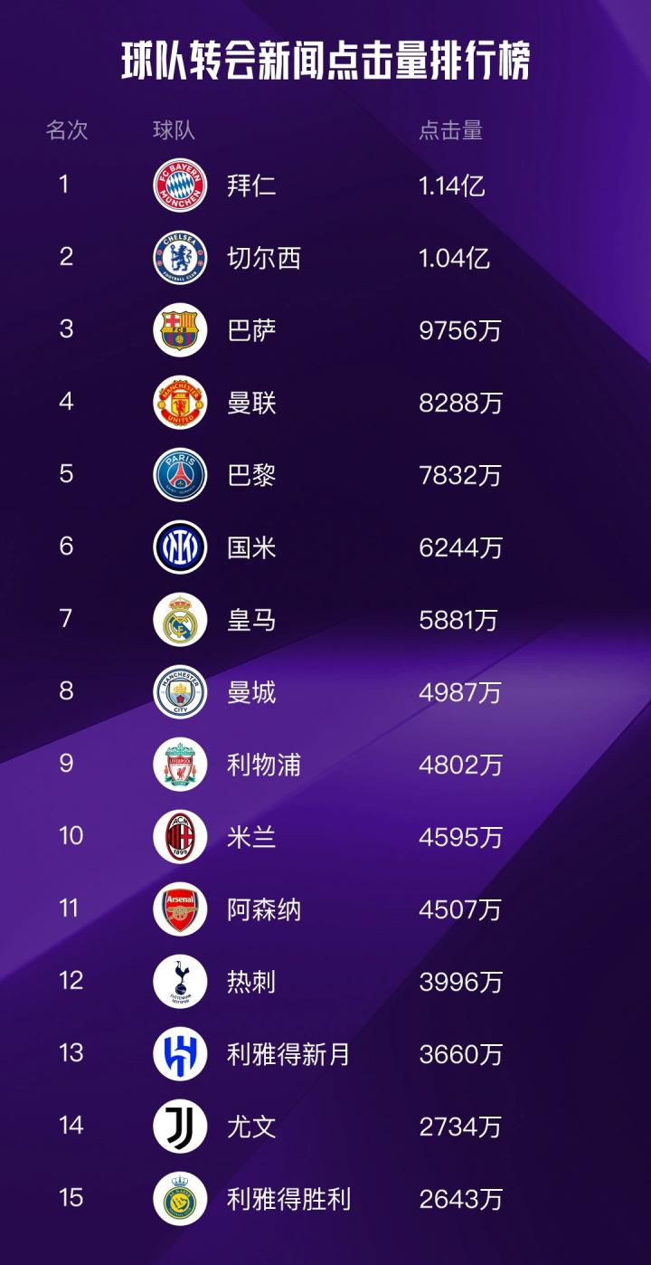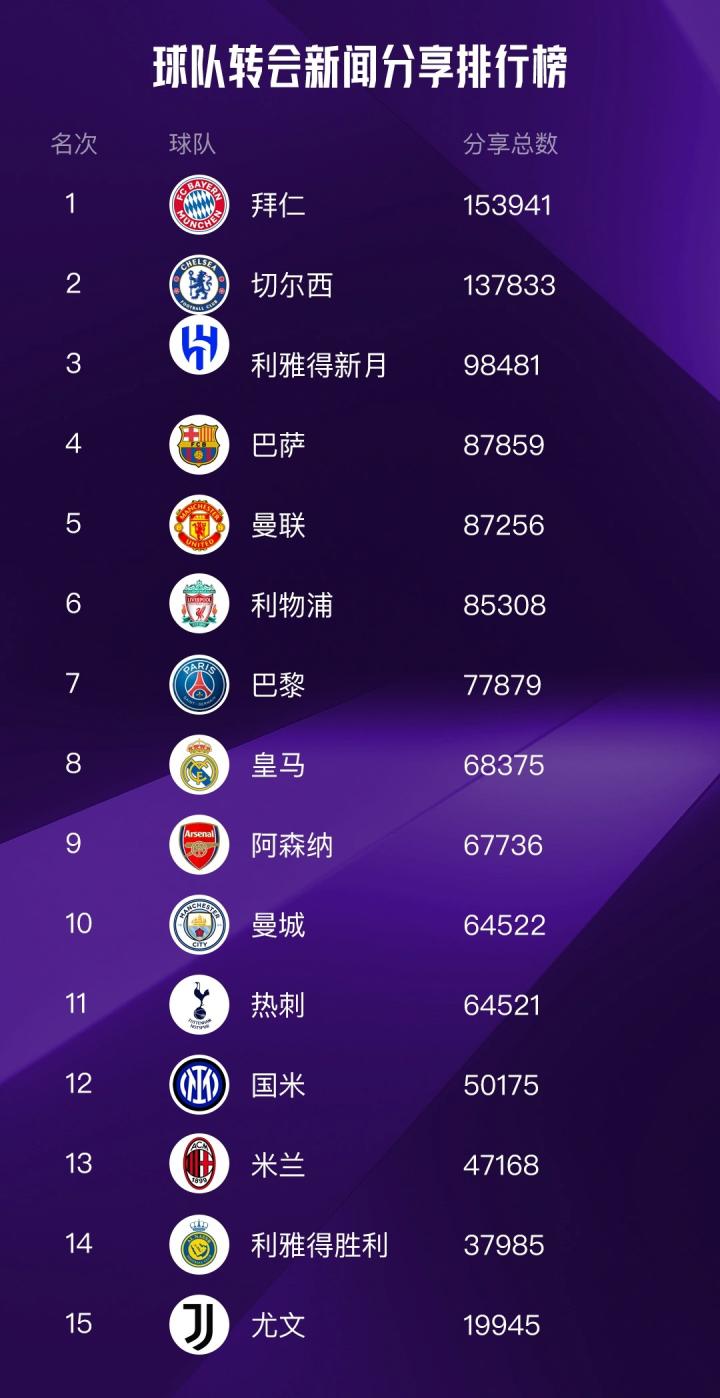 毫无意外,拜仁和切尔西再次分列前二,值得一提的是利雅得新月冲到了前三名,力压巴萨、曼联等一众欧洲豪门,这显然也和内马尔转会的高分享数据不无关系。