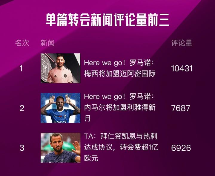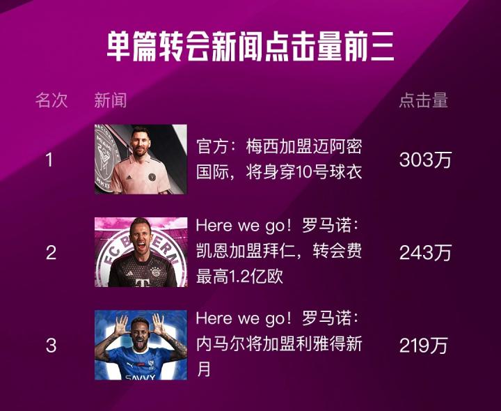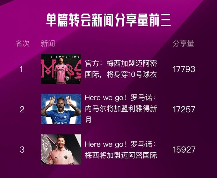 3.2023年夏窗转会单篇热度最高的转会新闻是梅西加盟迈阿密国际,梅西的下一站是大家转会窗最为关心的一条转会!