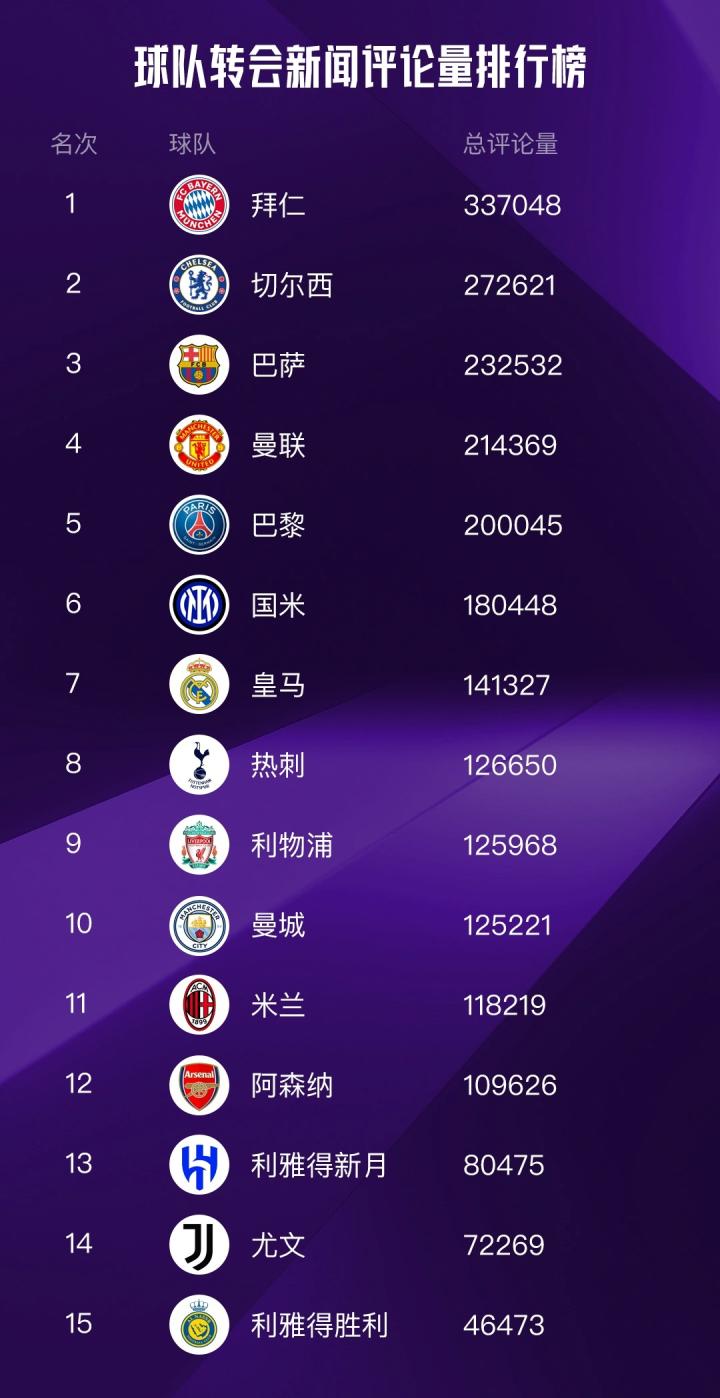拜仁再次凭借他们跌宕起伏的转会剧情喜提头名,看来仁迷对转会消息有许多话不吐不快,紧随其后的是剧情同样精彩的切尔西、巴萨、曼联。