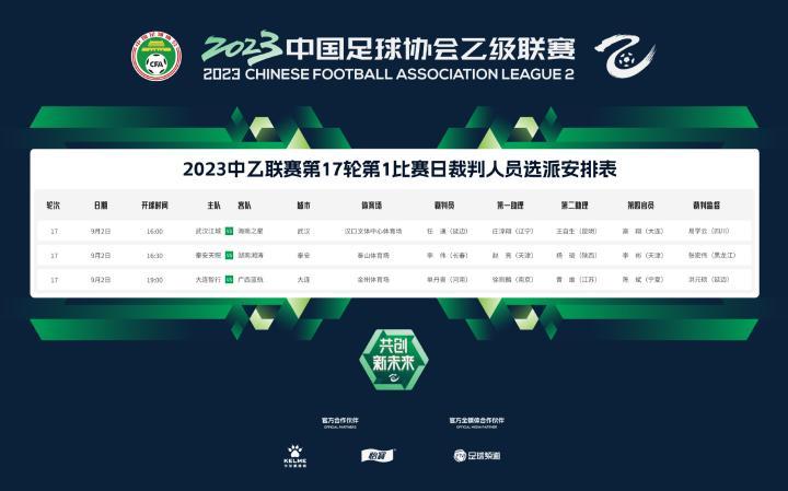 9月2日,2023赛季中乙联赛第17轮也就是决赛阶段第3轮先赛3场。赛前,中乙官方公布了这3场比赛的裁判人员选派安排表。