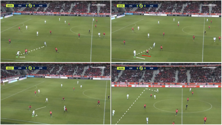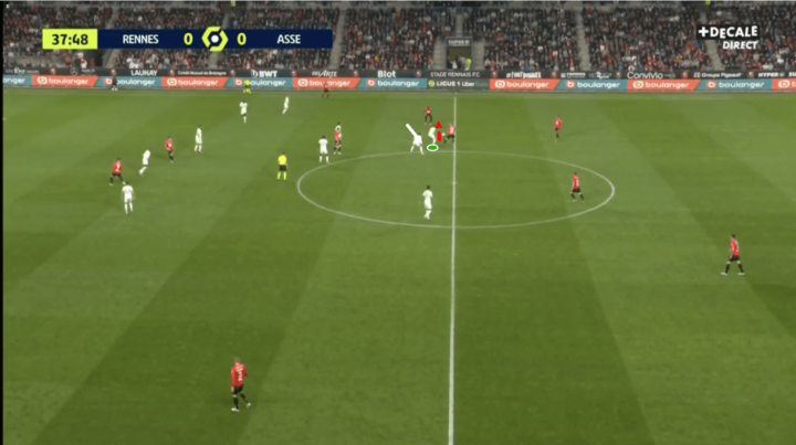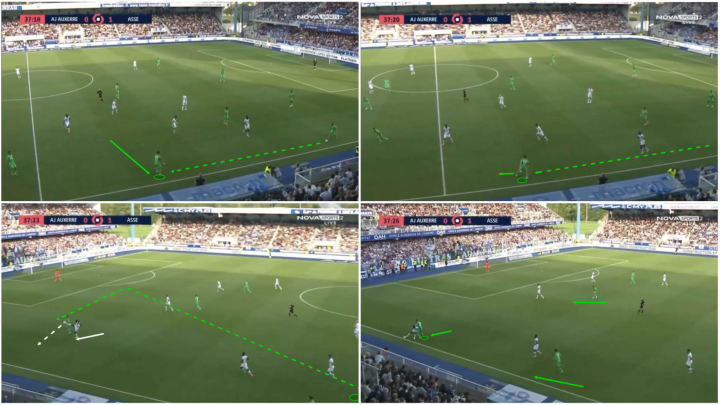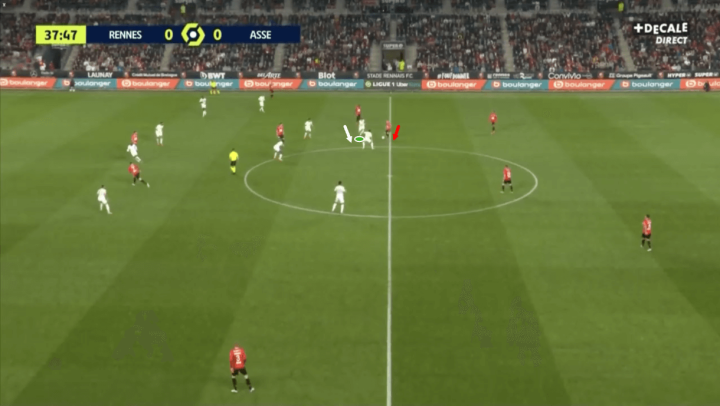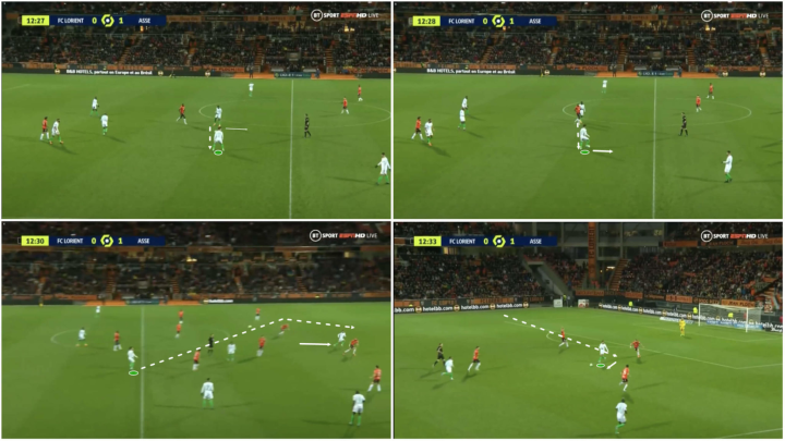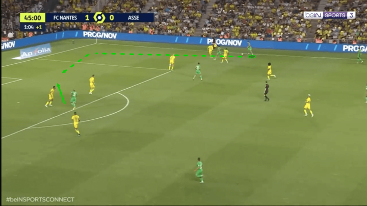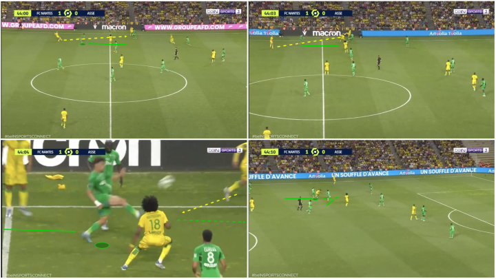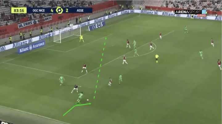 随后,奥齐奇送出过顶长传,前锋心领神会向中路移动。不幸的是,这脚精彩传球被对方后卫断下,奥齐奇被迫回追拦截,但在这之后,圣埃蒂安队趁机在边路找到了不错的位置,并通过压迫让对手的进攻受阻。