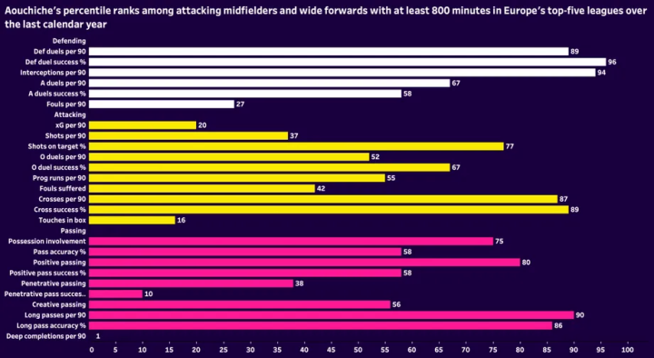 事实上,奥齐奇经常喜欢在中圈位置带球推进,同时为纵深区域的队友提供另一种传球选择。他喜欢在较深区域拿球时利用自己的长传能力,他的长传能力排名非常靠前。此外,他的长传质量也令人印象深刻。