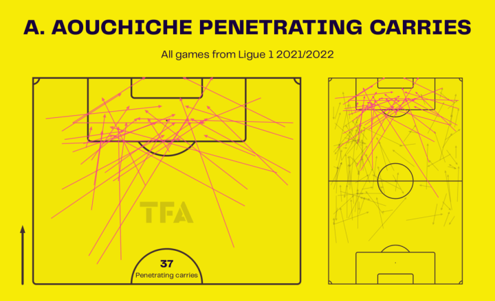 上图显示了奥齐奇在圣埃蒂安的 "穿透性带球"。该图突出显示了奥齐奇在球场上的带球以及在禁区附近的动作。从图中我们可以看出,奥齐奇通常从大禁区边缘或至少是半场开始带球和跑动,而从不是真正从中路开始。