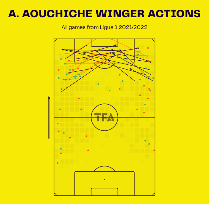 如前所述,奥齐奇的活动区域通常较深,不是典型的边锋或前腰。他喜欢的位置相对靠后,以便参与最初的控球过程,并充分发挥自己的长传优势。
