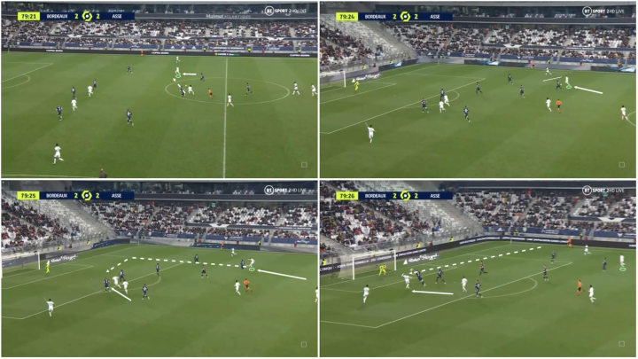 在回撤到起始位置后,他再次从距离他最近的中场球员手中接球,但与之前相比,他现在拥有了更多的调整时间和空间。在左下角的图中,我们可以看到这名球员是如何利用这段时间和空间来抬头观察传球选择,同时准备长传。