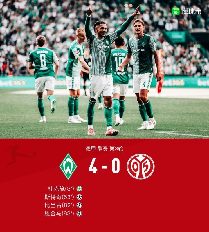 北京时间9月02日德甲 联赛 第3轮,云达不莱梅主场对阵美因茨。云达不莱梅杜克施破门,斯特奇破门,比当古破门,恩金马破门。最终比分4-0。