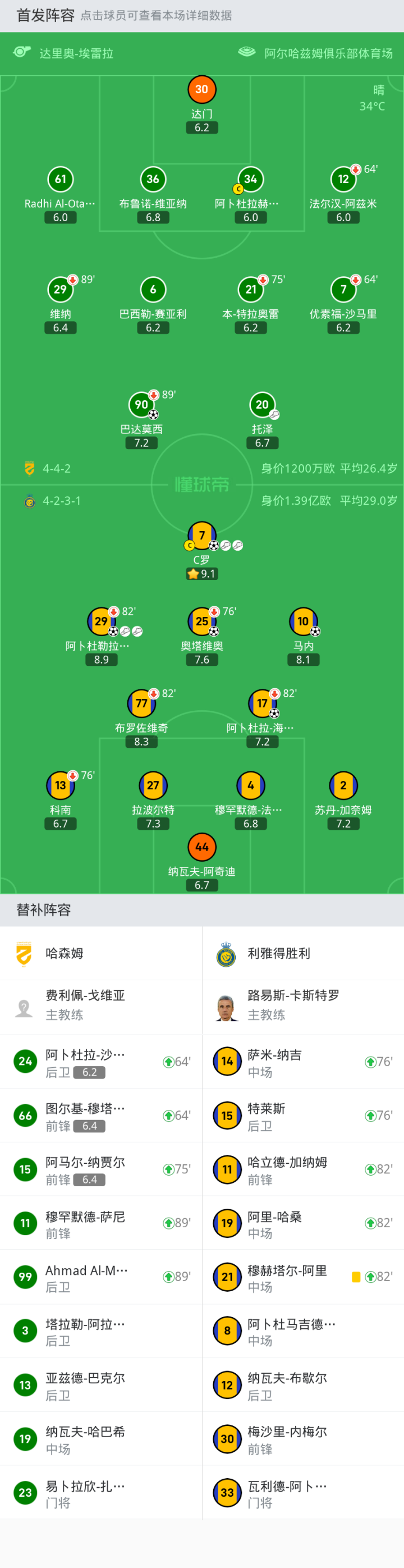 利雅得胜利首发:C罗, 布罗佐维奇, 拉波尔特, 穆罕默德-法蒂勒, 马内, 奥塔维奥, 苏丹-加奈姆, 科南, 阿卜杜拉-海巴里, 阿卜杜勒拉赫曼-加里卜, 纳瓦夫-阿奇迪