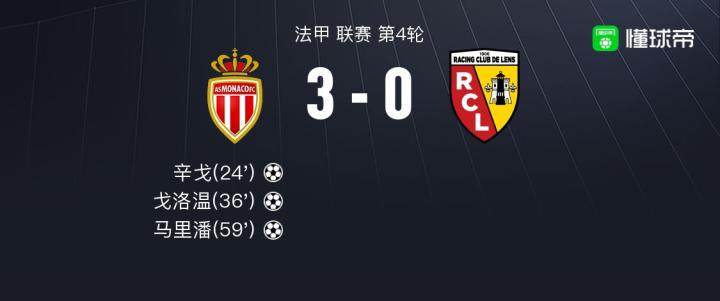 摩纳哥3-0朗斯,马里潘破门,戈洛温建功