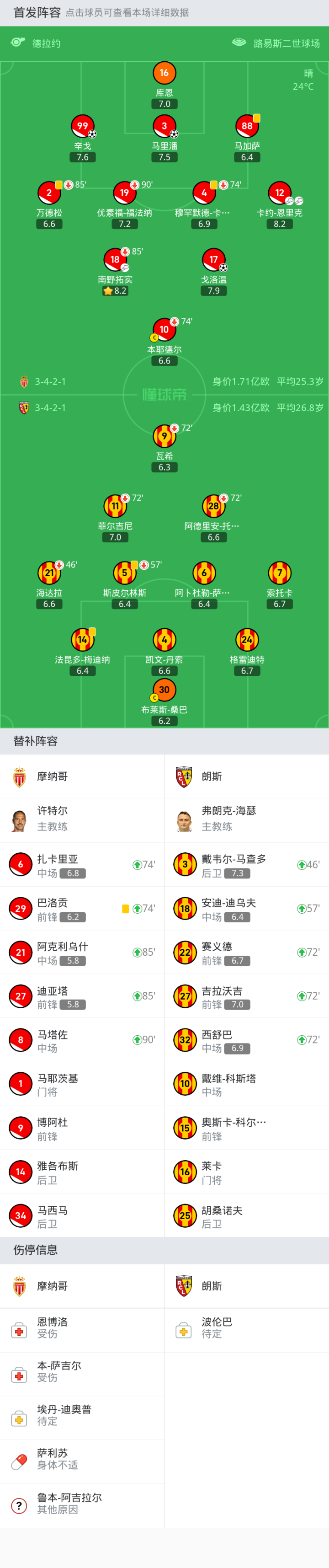 摩纳哥首发:本耶德尔, 南野拓实, 马里潘, 戈洛温, 卡约-恩里克, 库恩, 穆罕默德-卡马拉, 优素福-福法纳, 辛戈, 万德松, 马加萨