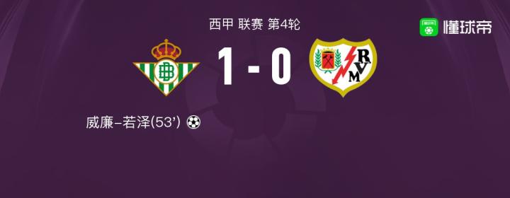 北京时间9月03日西甲 联赛 第4轮,皇家贝蒂斯主场对阵巴列卡诺。皇家贝蒂斯威廉-若泽破门。最终比分1-0。