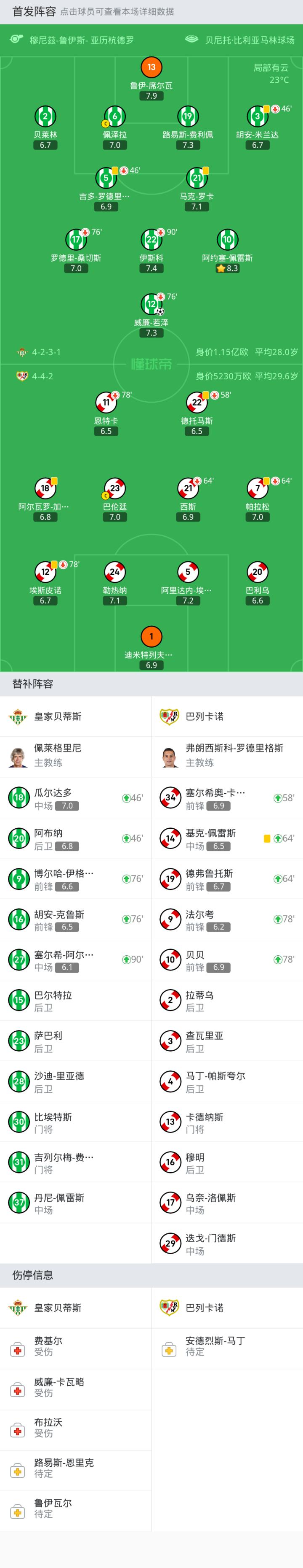 巴列卡诺首发:阿里达内-埃尔南德斯, 勒热纳, 德托马斯, 迪米特列夫斯基, 巴利乌, 阿尔瓦罗-加西亚, 埃斯皮诺, 巴伦廷, 帕拉松, 西斯, 恩特卡