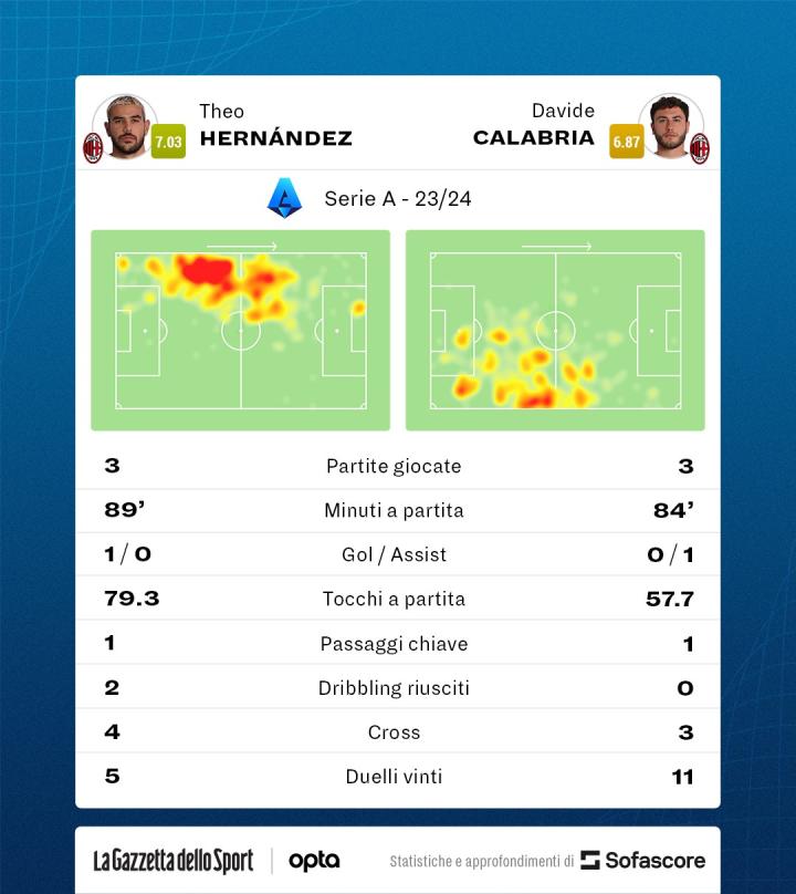 用数字说话。卡拉布里亚在前三场比赛中场均57.7次触球(对阵博洛尼亚57次,对阵都灵54次,在罗马62次),而特奥的这一数字显然更高。法国人的平均触球次数达到79.3次(在前三场比赛中分别为74次、71次甚至93次),他的一记漂亮的进球为他锦上添花。边后卫的作用让防守球员失位,将防线撕开,但最重要的是为赖因德斯和奇克的突破腾出了空间。目前,有两张王牌。两人各有一次助攻(荷兰人在对阵博洛尼亚的比赛中为吉鲁助攻,英国人在对阵都灵的比赛中为普利西奇助攻),证明了他们可以为球队带来高质量的传递和新鲜空气。由于攻击方式发生了变化,托纳利的告别变成了一个创造性转变的机会,边后卫也有这些优点。