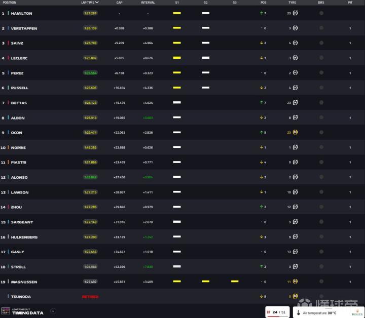 第27圈,塞恩斯超越汉密尔顿,回到第2位,随后勒克莱尔也完成对汉密尔顿超越。