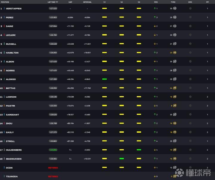 第15圈,维斯塔潘超越塞恩斯!本场比赛首次领跑。佩雷兹随后超越拉塞尔,来到第4位。