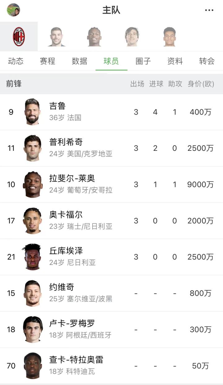 前锋:吉鲁、莱奥、普利西奇、奥卡福尔、丘库埃泽、约维奇