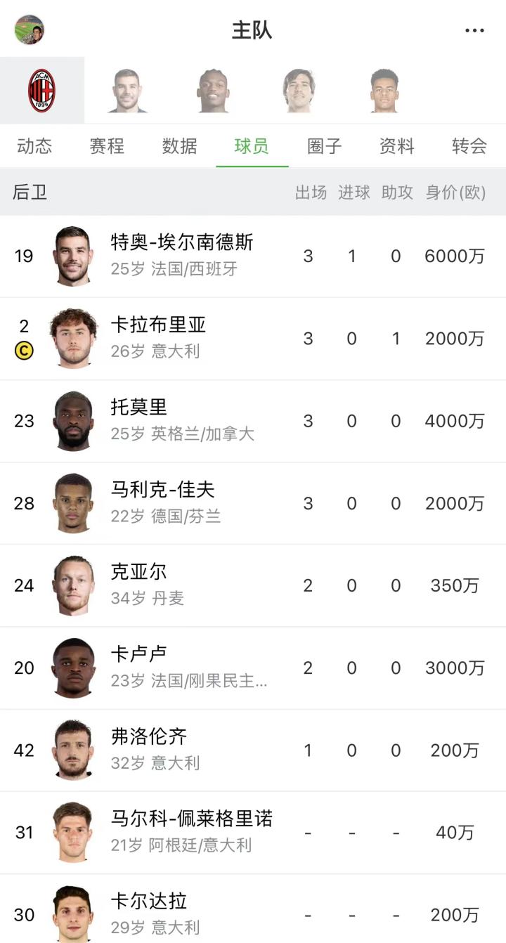 后卫:特奥、托莫里、佳夫、卡卢卢、克亚尔、卡拉布里亚、弗洛伦齐、卡尔达拉