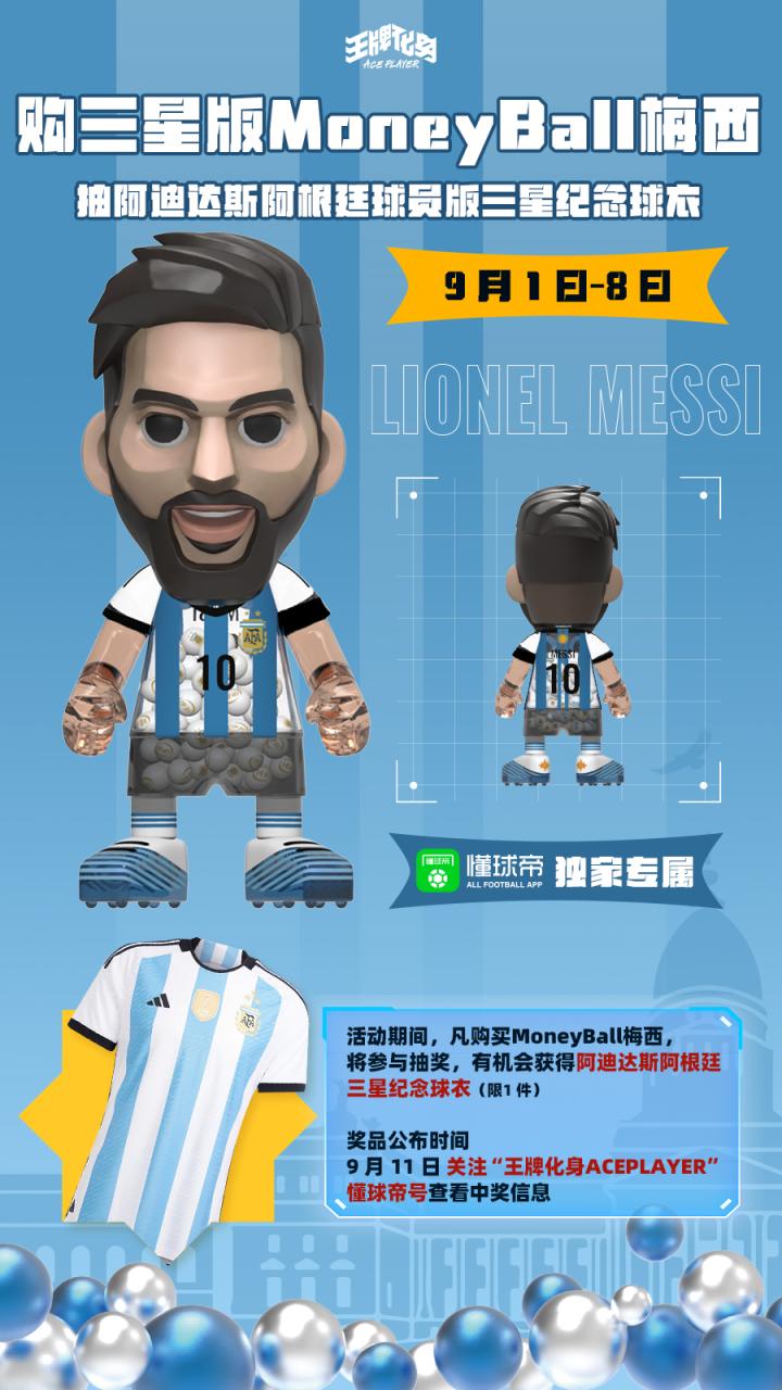9 月 1 日到 9 月 8 日,关注王牌化身,参与王牌化身懂球帝专属购买三星版MoneyBall梅西手办,将参与抽奖,有机会将阿迪达斯球员版三星纪念球衣带回家(限1 件)。奖品公布时间, 9 月 11 日关注“王牌化身ACEPLAYER”懂球帝号,查看中奖信息。